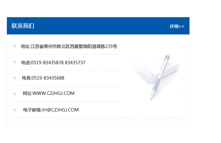 地址:常州市新北區友邦商務大廈1幢16、17層  電話:0519-85101652  傳真:0519-85112595  郵編:213022  網址:www_cz-jiayue_cn.bddingen.com  郵箱:xiajifengaa@163.com